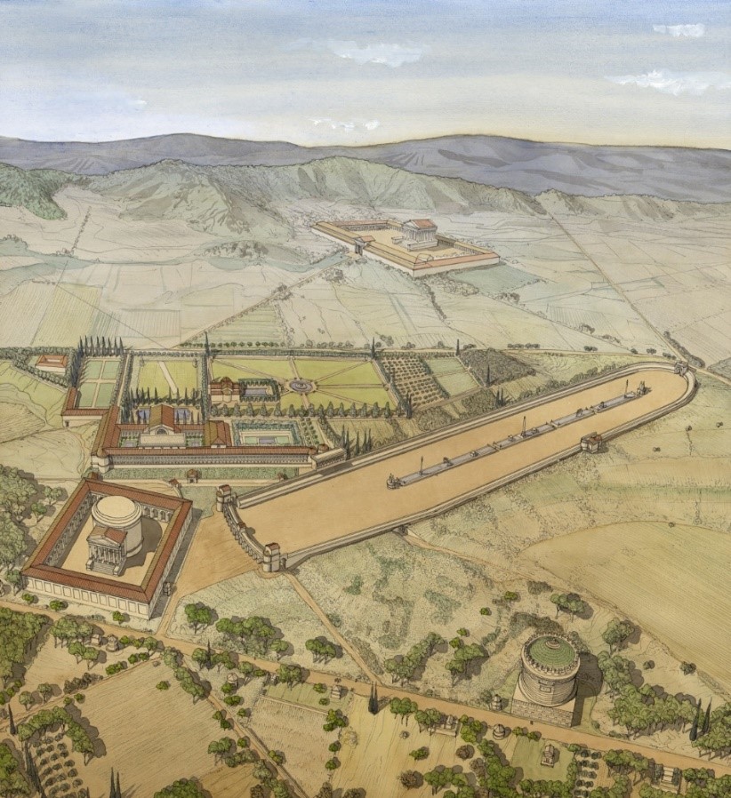 Constaba de las mismas partes que el teatro y se decoraba también con lujosos pavimentos y estatuas.
